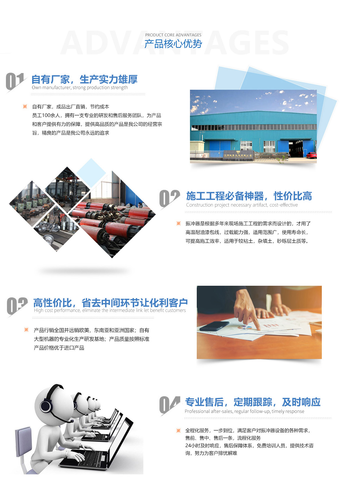 振沖器是振沖法施工中的特制機具。它產(chǎn)生水平向振動力振擠填料及周圍土體,而達到提高地基承載能力、減少沉降量、增加地基穩(wěn)定性、提高抗地震液化能力。 振沖法施工時除原地沖器外,尚需行走式起吊裝置,泵送輸水系統(tǒng),控制操作臺等。如工程單位缺乏起重機,本廠還供應(yīng)振沖器施工樁架,樁架有單邊滾管立柱式、液壓步履式、簡易履帶式等。